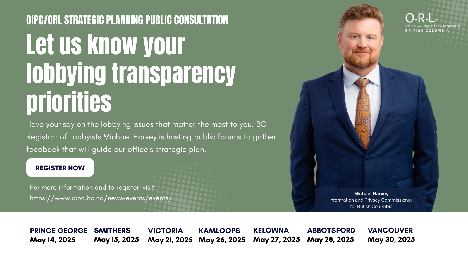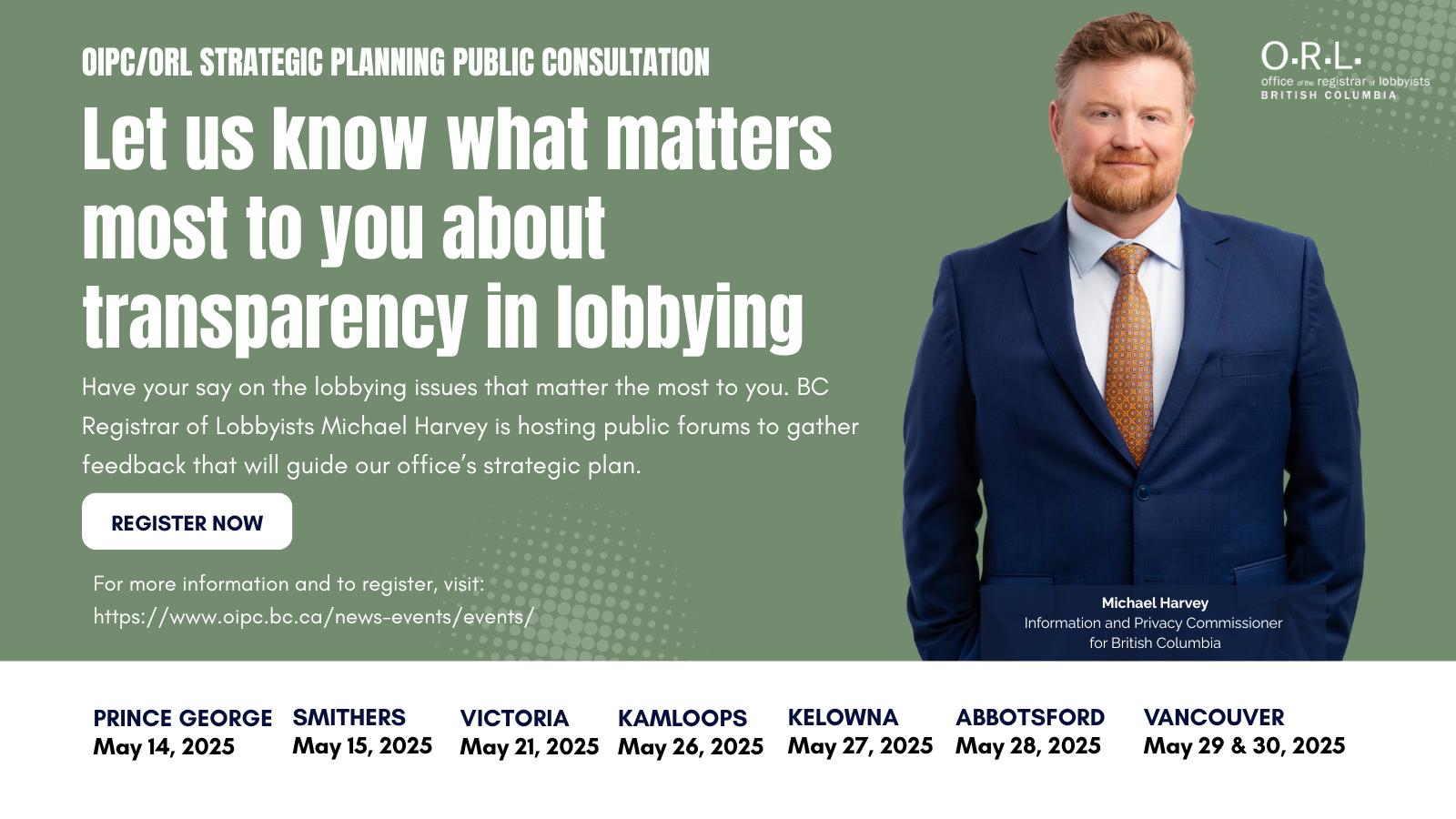 Michael Harvey, Registrar of Lobbyists and Information and Privacy Commissioner for BC, is inviting the public to share what they think the offices’ priorities should be over the next three years – what matters most to them in the areas of access to information, privacy and lobbying.